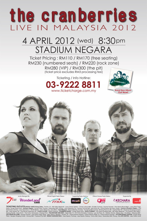 The Cranberries Live in Malaysia 2012 is absolutely the comeback concert of one of the world’s biggest bands. Definitely not to be missed. For further info, contact TicketCharge hotline at +603 9222 8811.
